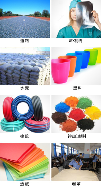 ④ 适用工业品填料中:在油漆工业中,重晶石粉填料可以增加漆膜厚度、强度及耐久性。 在造纸、橡胶、塑料领域,重晶石料能提高橡胶和塑料的硬度、耐磨性及耐老化性; 锌钡白颜料也用于制造白色油漆,在室内使用比铅白、镁白具有更多的优点。